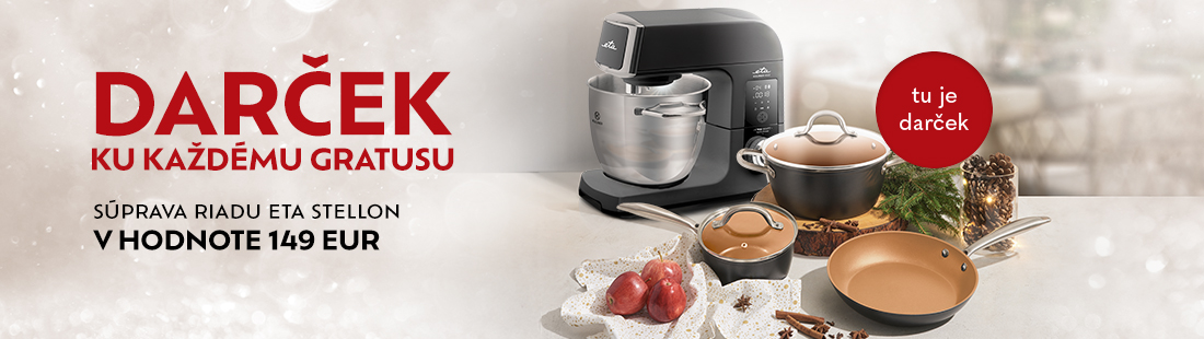 Pokiaľ kuchynský robot stále nemáte, práve teraz je tá správna chvíľa ho kúpiť. Vyberte si z širokej ponuky kuchynských robotov, zaregistrujte svoj nákup a získajte Sadu riadu ETA Stellon ako darček.