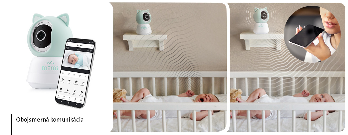 Zabudovaný mikrofón a reproduktor umožňujú obojsmernú komunikáciu, takže svoje dieťa upokojíte, aj keď nie ste priamo v miestnosti. S uspávaním pomôžu prednastavené uspávanky v pamäti pestúnky ETA MIMI a funkcie ako ochranná zóna, siréna či upozornenie na kŕmenie vám prinesú ešte vyššiu úroveň kontroly pri starostlivosti o dieťa.