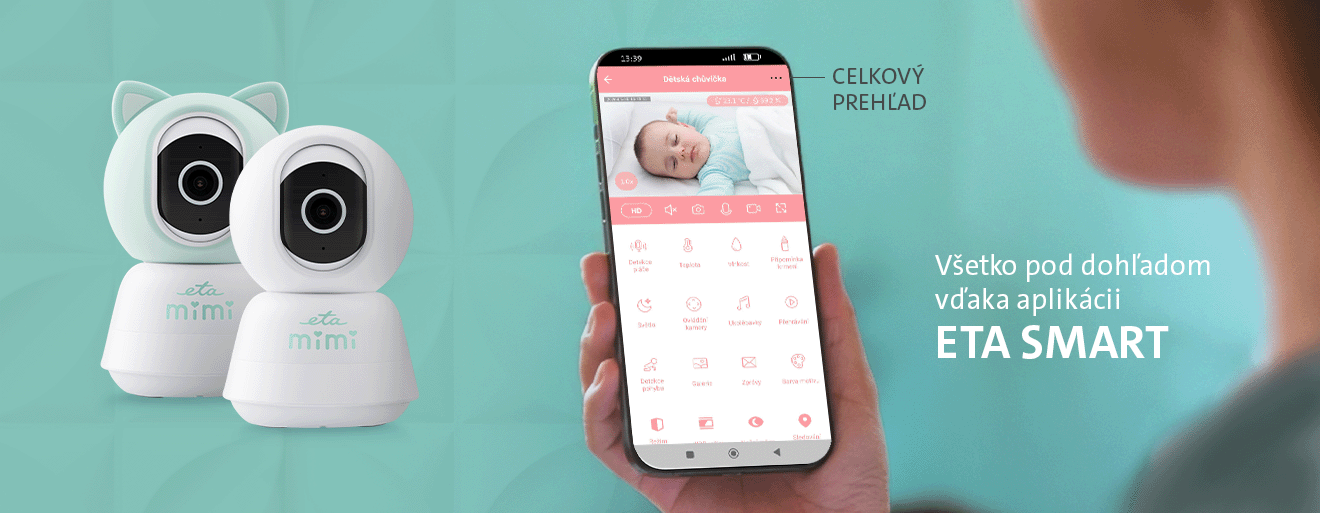 Aplikácia ETA Smart vám umožní mať svoje dieťa pod dohľadom kedykoľvek a odkiaľkoľvek. Stačí pestúnku pripojiť k Wi-Fi (2,4 GHz) a spárovať ju s telefónom alebo tabletom. V aplikácii potom v reálnom čase sledujete obraz, prehrávate záznamy a nastavujete upozornenia. Prístup je možné zdieľať až pre 4 účty, takže mama, otec aj starí rodičia môžu sledovať prenos súčasne.