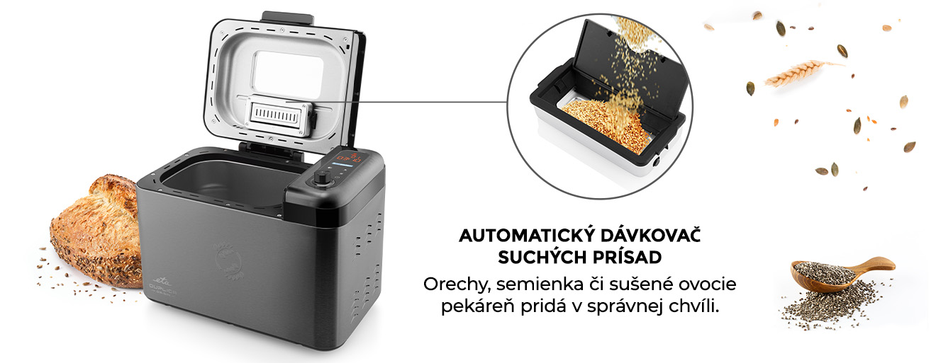 Na domácu pekáreň ETA Duplica II Origin sa môžete vždy spoľahnúť. Automaticky pridá suché orechy, semienka či sušené ovocie v presne stanovenom okamihu – vy sa tak nemusíte o nič starať a prísady nebudú nadmerne rozdrvené, čo zaručuje ich dokonalú textúru a chuť.