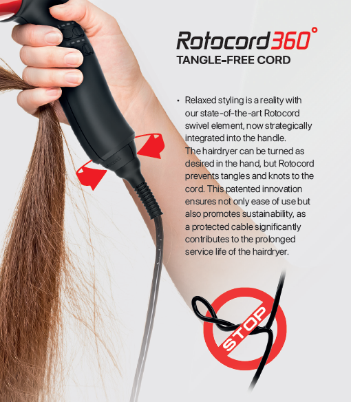 Vďaka patentovanej technológii ROTOCORD sa napájací kábel môže voľne otáčať o 360°, čo eliminuje zamotávanie a uzly, ktoré často komplikujú styling. Tento inovatívny otočný prvok je teraz strategicky integrovaný do rukoväti, takže fén môžete pohodlne otáčať podľa potreby bez toho, aby sa kábel krútil. Ľahšia manipulácia znamená nielen komfortnejšie použitie, ale aj dlhšiu životnosť kábla a vyššiu udržateľnosť, čo robí z ROTOCORD technológie naozajstnú investíciu do kvalitnej starostlivosti o vlasy.