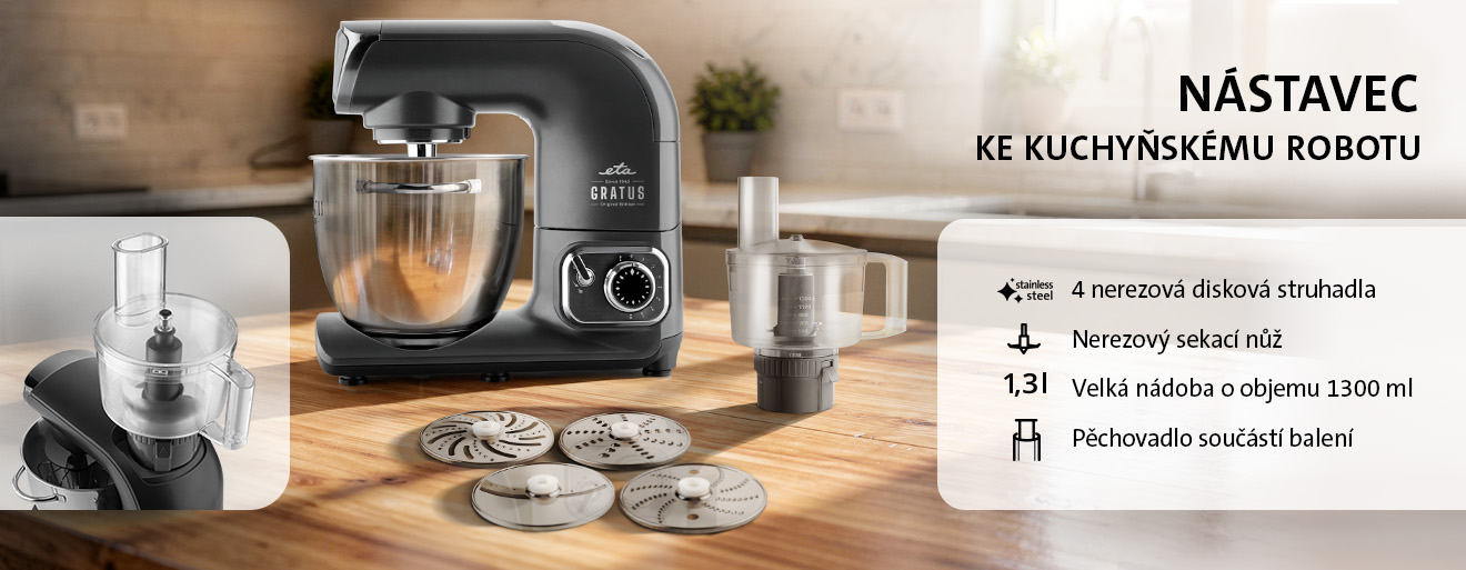 Praktický nástavec ke kuchyňským robotům ETA Kuliner II (ETA2038), Gratus EVO (ETA1028) a Gratussino III (ETA3023) dosahuje rychlosti až 1400 ot./min., pyšní se nádobou o objemu 1300 ml a nabízí široké možnosti zpracování potravin. Umožňuje krájení, strouhání, trhání i sekání. Součástí jsou snadno omyvatelná kvalitní nerezová struhadla a srpovitý nůž.