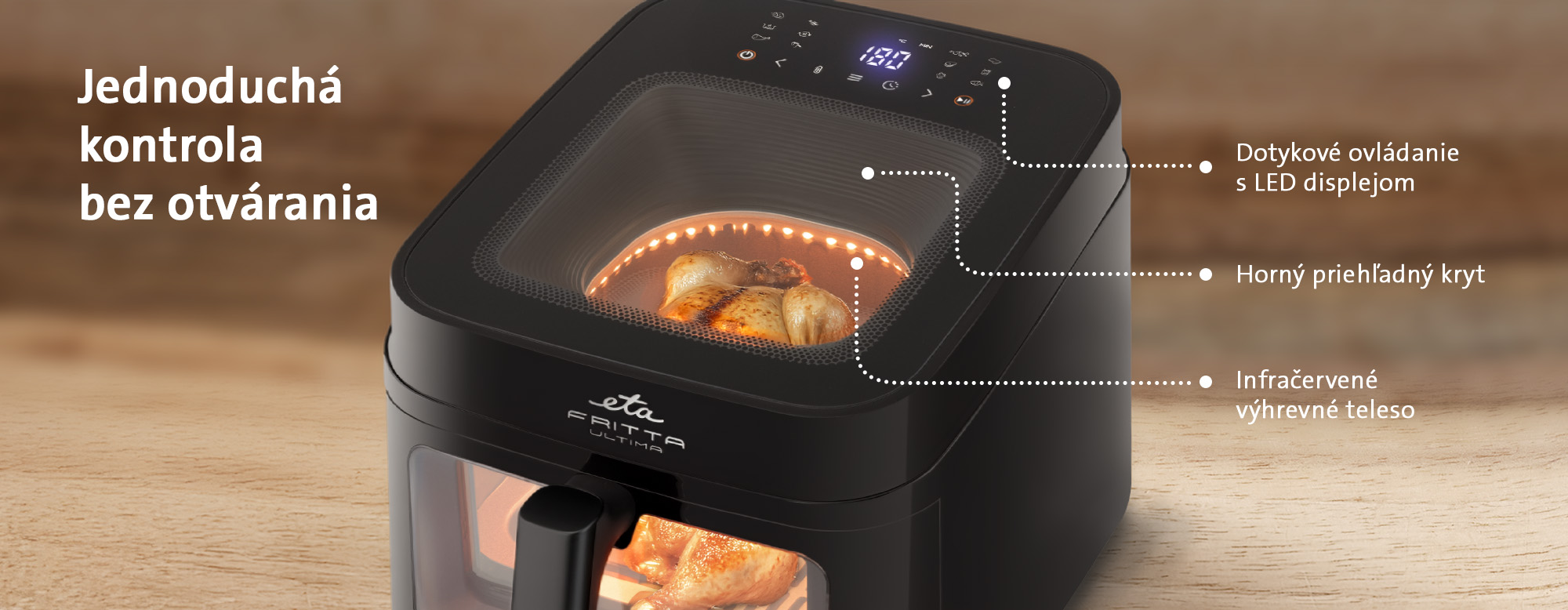 Teplovzdušná fritéza ETA Fritta Ultima kombinuje cirkuláciu horúceho vzduchu s infračerveným výhrevným telesom, ktoré sa postará o rýchle a rovnomerné prepečenie jedla zo všetkých strán a zároveň vnútorný priestor príjemne osvetľuje. Vďaka tomu máte ešte lepšiu kontrolu nad výsledkom a nikdy vám neunikne ten správny moment, keď je pokrm dokonale pripravený.