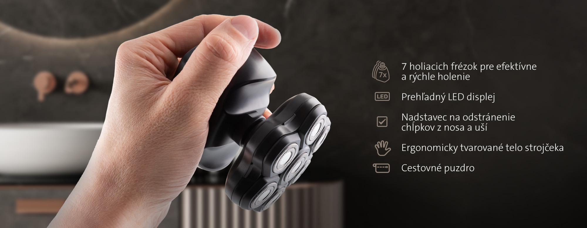 Hľadáte spoľahlivého pomocníka na pravidelnú úpravu svojho krátkeho účesu alebo hlavy? Moderný holiaci strojček na hlavu ETA Jason vám ponúkne pohodlie, výkon aj jednoduchú údržbu v jednom. Bol navrhnutý tak, aby spĺňal potreby moderného muža, ktorý hľadá rýchlosť, komfort a precízny výsledok. Telo strojčeka je ergonomicky tvarované, skvele sadne do dlane a zaručuje pohodlný a istý úchop aj pri dlhšom používaní. Vďaka špeciálnej holiacej hlave vybavenej 7 frézkami ľahko sleduje obrysy hlavy a postará sa o rýchle a presné oholenie bez nepríjemného ťahania. Flexibilná konštrukcia navyše zabezpečuje, že sa hlavica vždy prispôsobí vašim individuálnym potrebám.