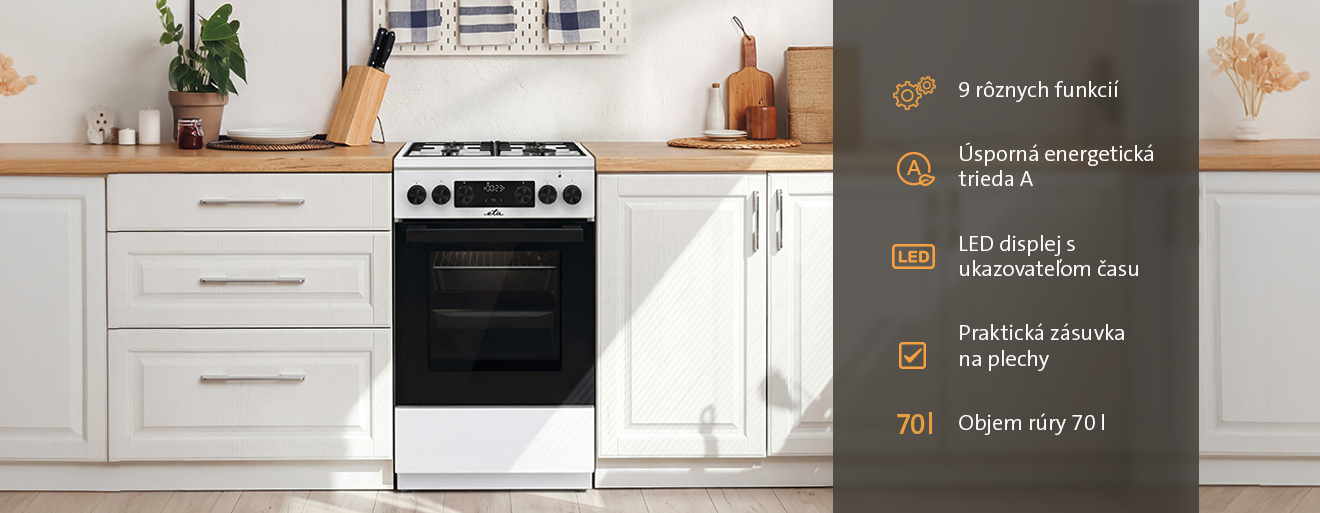 Kombinovaný sporák ETA v klasickom bielom prevedení krásne zapadne do každej modernej kuchyne. S jeho elektrickou rúrou o objeme 70 litrov a 9 chytrými funkciami vám pôjde pečenie samo. Vďaka nízkej spotrebe je sporák ETA zaradený do energetickej triedy A.