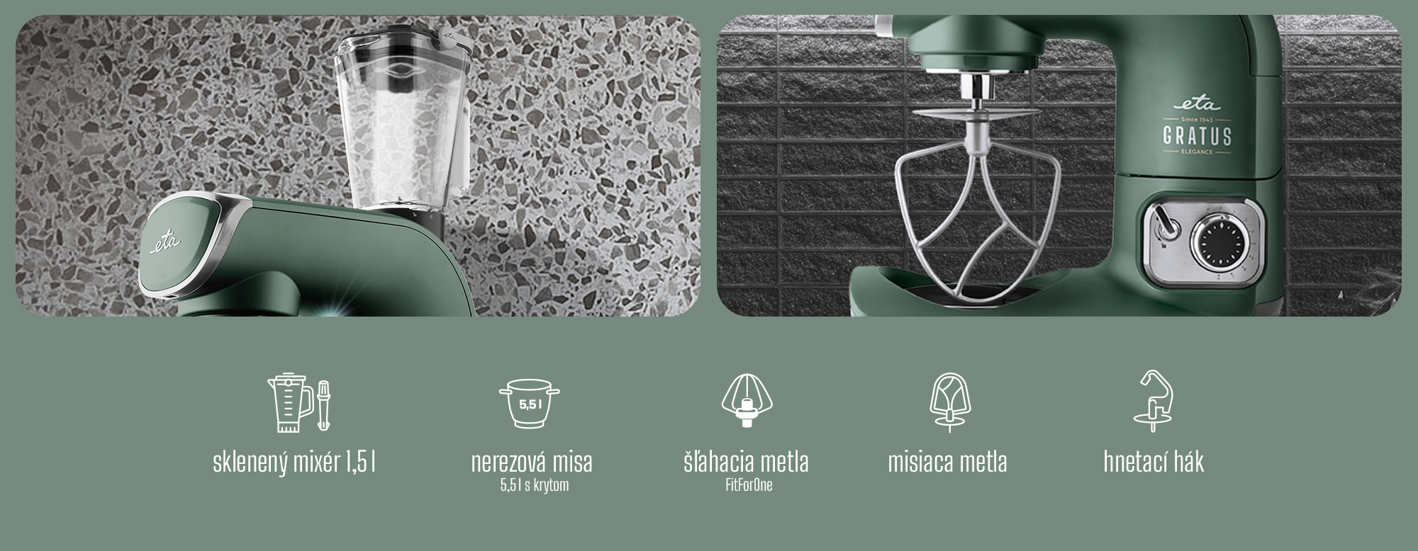 ETA Gratus EVO Elegance je spoľahlivý kuchynský robot v nadčasovom dizajne s výkonným motorom a celokovovým prevedením, ktoré vydrží roky. Jeho príslušenstvo v balení vám uľahčí každé pečenie aj prípravu zdravých smoothie. Ak si chcete jeho funkcie rozšíriť o ďalšie možnosti, pozrite si ponuku príslušenstva, ktoré si môžete dokúpiť: