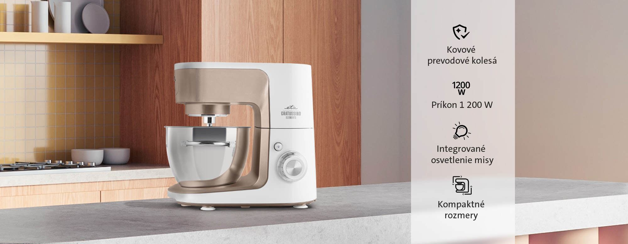 ETA Gratussino III Elements je dôkazom toho, že kuchynský robot môže byť nielen výkonným pomocníkom, ale aj dizajnovým doplnkom. Hodí sa do menších aj väčších kuchýň, kde oceníte nielen jeho funkčnosť, ale aj kompaktné rozmery a jednoduché ovládanie. Samozrejmosťou je aj bezpečnostné výklopné rameno, protišmykové nožičky a možnosť umývania nekovových častí v umývačke riadu.
