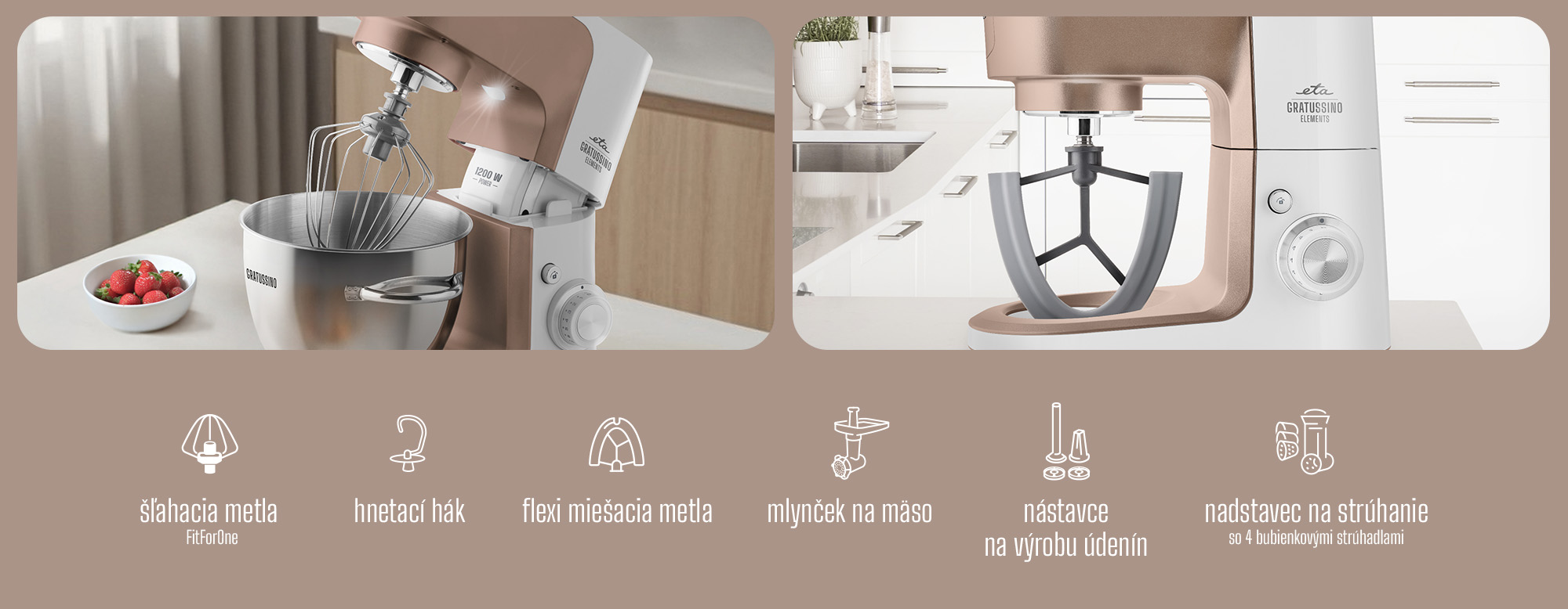 ETA Gratussino III Elements je kuchynský robot zo štýlovej edície „Elements“, ktorá vdýchne každej kuchyni osobitý štýl. Rovnako ako ručné šľahače ETA Lento Elements z rovnakej série, aj Gratussino III prichádza v troch elementárnych farbách – terra (Zem), sole (Slnko) a luna (Mesiac) – inšpirovaných základnými prvkami nášho života. Spája v sebe nadčasový dizajn, spoľahlivosť a výbavu, ktorá vás nesklame ani pri náročnejšom varení.