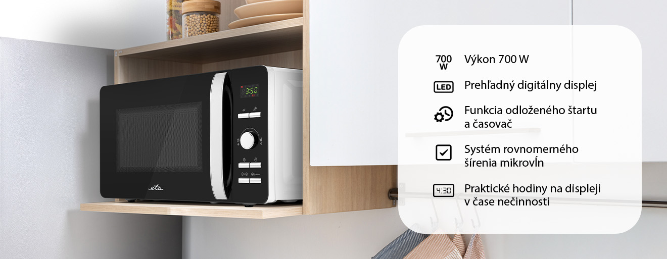 Mikrovlnná rúra ETA Gavento ponúka ideálnu kombináciu funkčnosti, jednoduchého ovládania a elegantného vzhľadu. S objemom 20 litrov a výkonom 700 W zvládne ohrievanie, varenie aj rozmrazovanie potravín s ľahkosťou. Systém rovnomerného šírenia mikrovĺn zabezpečuje dôkladné a rovnomerné prehriatie jedla bez studených miest. 8 automatických programov pokryje bežné potreby každodennej prípravy jedál – od rozmrazovania a ohrievania až po plnohodnotné varenie.
