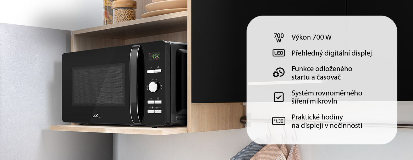 Ovládání mikrovlnky je díky digitálnímu displeji maximálně přehledné a intuitivní. Časovač je nastavitelný až do 60 minut a máte možnost využít i funkce odloženého startu. V době nečinnosti pak displej slouží jako praktické hodiny. O dokončení ohřevu vás informuje zvuková signalizace, Otočný skleněný talíř se postará o rovnoměrný ohřev a díky vnitřnímu osvětlení máte neustálý přehled o jeho průběhu.