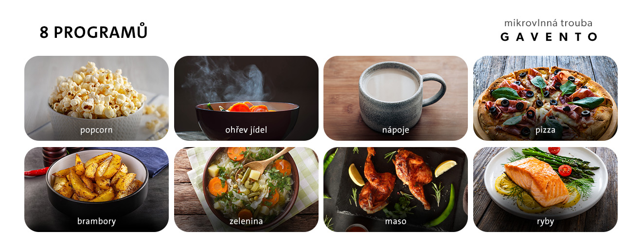 ETA Gavento nabízí 8 automatických programů, které pokryjí nejčastější potřeby při vaření a ohřívání – popcorn, ohřev jídel, nápoje, pizzu, brambory, zeleninu, maso a ryby. Trouba se automaticky vypne při otevření dvířek a nechybí ani dětská pojistka, která zabrání nechtěnému spuštění.