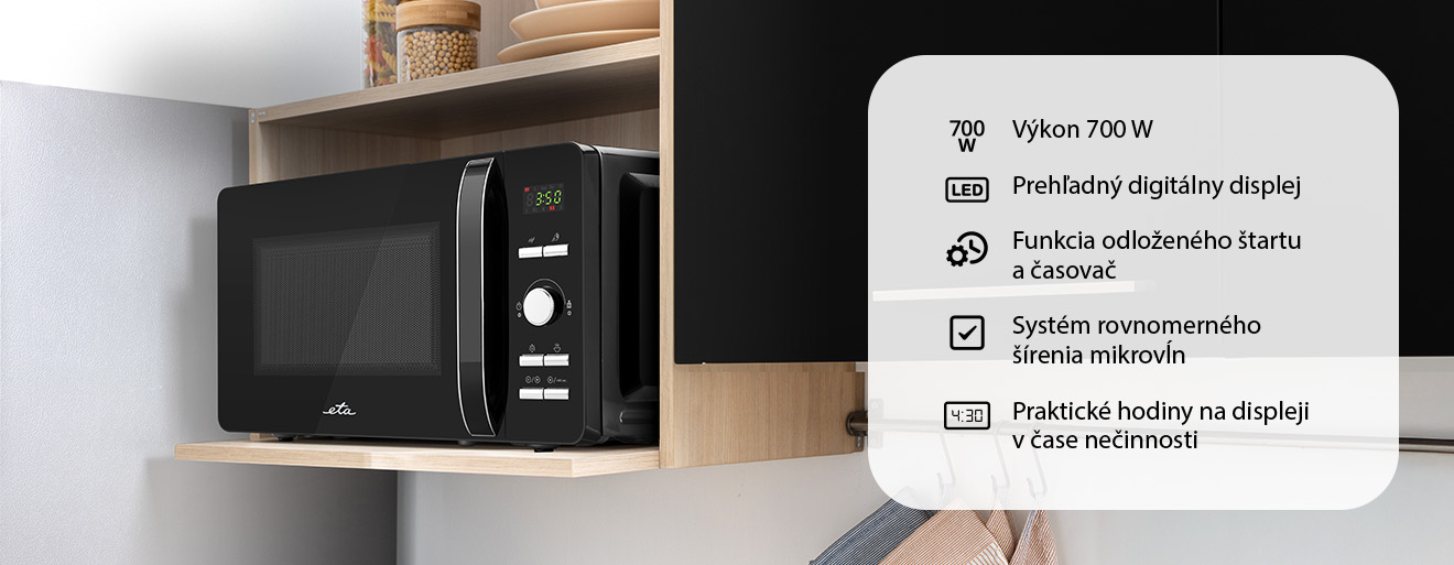 Mikrovlnná rúra ETA Gavento ponúka ideálnu kombináciu funkčnosti, jednoduchého ovládania a elegantného vzhľadu. S objemom 20 litrov a výkonom 700 W zvládne ohrievanie, varenie aj rozmrazovanie potravín s ľahkosťou. Systém rovnomerného šírenia mikrovĺn zabezpečuje dôkladné a rovnomerné prehriatie jedla bez studených miest. 8 automatických programov pokryje bežné potreby každodennej prípravy jedál – od rozmrazovania a ohrievania až po plnohodnotné varenie.
