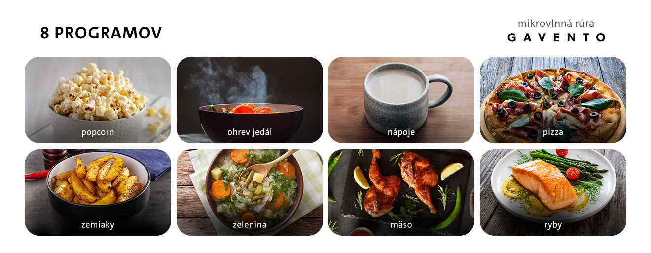ETA Gavento ponúka 8 automatických programov, ktoré pokryjú najčastejšie potreby pri varení a ohrievaní – popcorn, ohrev jedál, nápoje, pizzu, zemiaky, zeleninu, mäso a ryby. Rúra sa automaticky vypne pri otvorení dvierok a nechýba ani detská poistka, ktorá zabráni nechcenému spusteniu.
