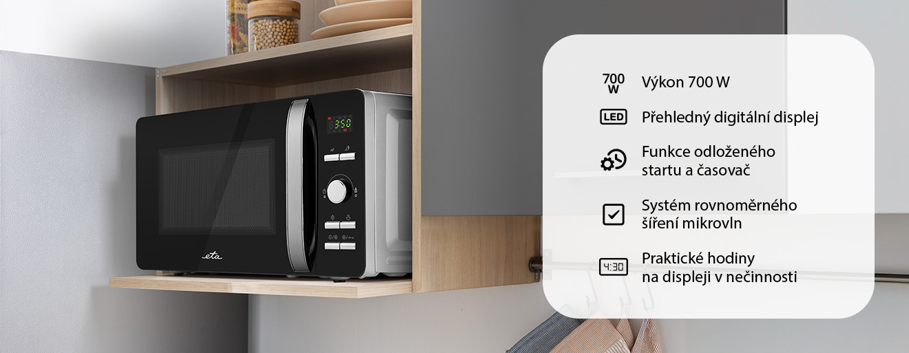 Ovládání mikrovlnky je díky digitálnímu displeji maximálně přehledné a intuitivní. Časovač je nastavitelný až do 60 minut a máte možnost využít i funkce odloženého startu. V době nečinnosti pak displej slouží jako praktické hodiny. O dokončení ohřevu vás informuje zvuková signalizace, Otočný skleněný talíř se postará o rovnoměrný ohřev a díky vnitřnímu osvětlení máte neustálý přehled o jeho průběhu.