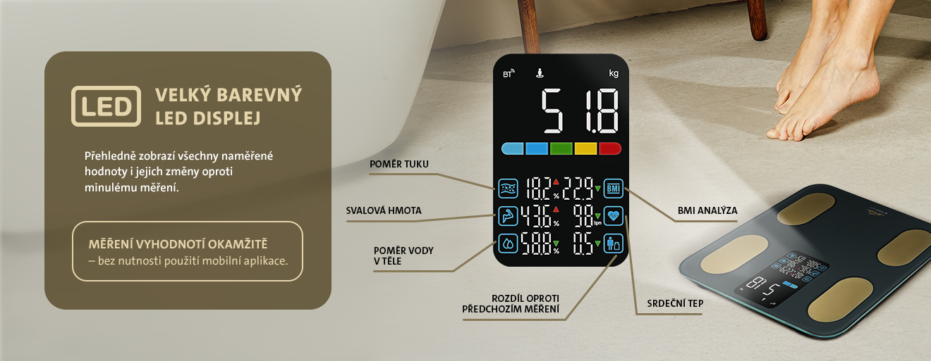 I bez propojení s aplikací váha zůstává praktickým pomocníkem a okamžitě po nastoupení na vážicí plochu zobrazí aktuální hmotnost a vybrané parametry přímo na velkém LED displeji.