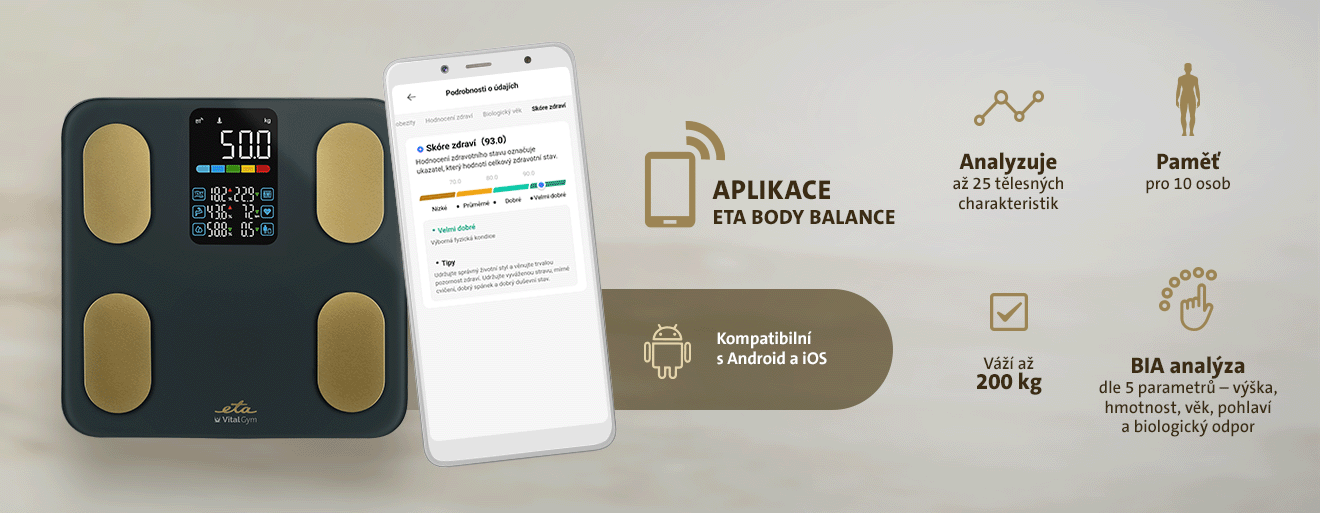 Aplikace ETA Body Balance po spárování zobrazuje, analyzuje a ukládá až 25 tělesných charakteristik, např.: