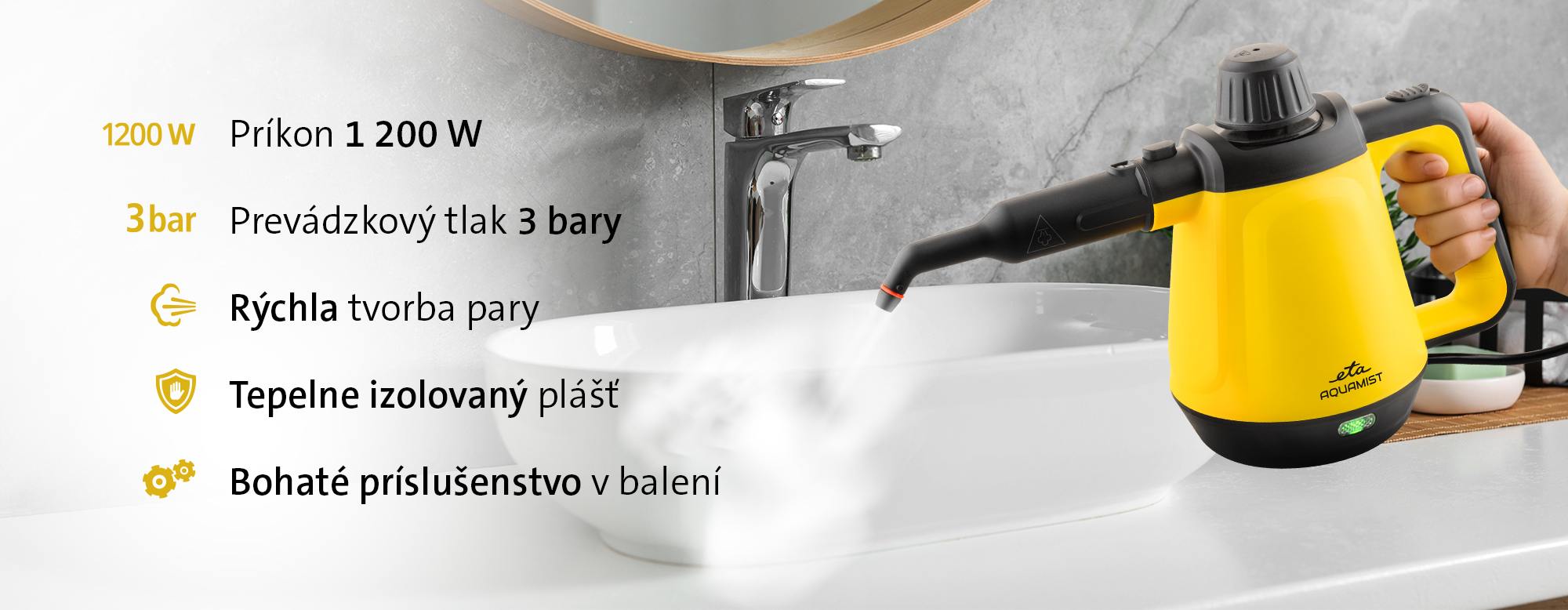 Parný čistič ETA Aquamist si poradí s takmer celou domácnosťou – od kúpeľne po záhradný gril. Vďaka prevádzkovému tlaku 3 bary sa postará o mastnotu, vodný kameň aj zanesené škáry. Ohrev vody zaberie 2 – 3 minúty a nádoba s objemom 250 ml vydrží produkovať paru až 7 minút.