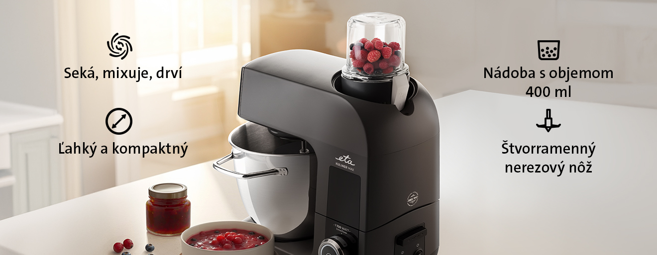 Sekáčik potravín je praktickým dokúpiteľným príslušenstvom ku kuchynským robotom Kuliner II, Gratus EVO a Gratussino III. Po inštalácii na robot je sekáčik ETA schopný sekať, mixovať a drviť širokú škálu surovín – ovocie, zeleninu, orechy, kávu, mak, sušené bylinky či koreniny – na veľmi jemnú konzistenciu. Využijete ho pri príprave nátierok, marinád, pesta, detských príkrmov, pyré alebo dresingov. Sekáčik je ľahký, kompaktný a jednoducho skladovateľný.
