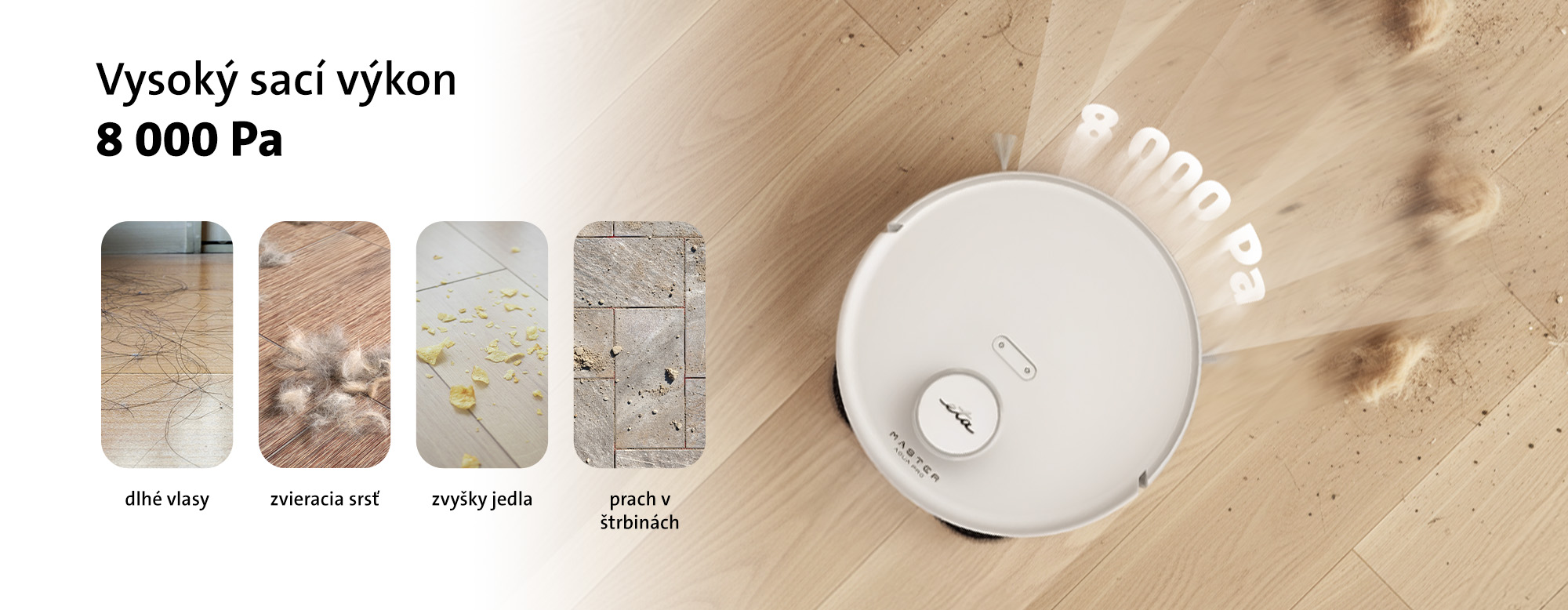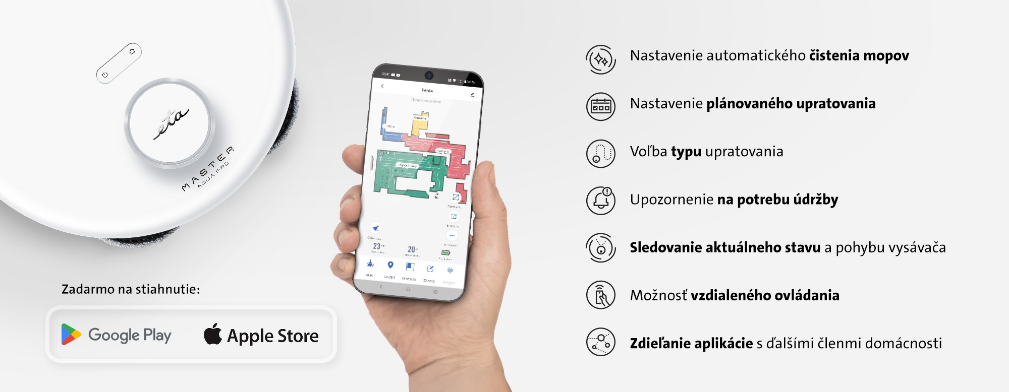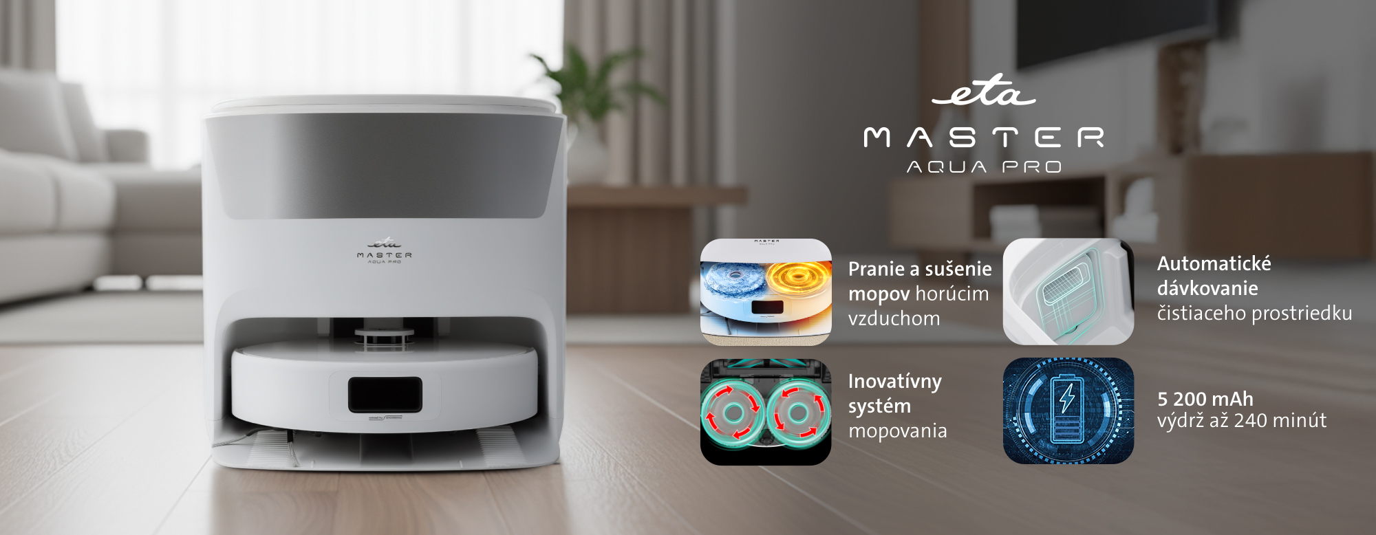 Robotický vysávač ETA Master Aqua Pro s rotačnými mopmi spája 4 funkcie v 1 a prináša špičkové čistenie podláh bez námahy. Inovatívny systém mopovania ponúka automatické pranie a sušenie mopov horúcim vzduchom (až 45 °C) aj automatické dávkovanie čistiaceho prostriedku. Špeciálna konštrukcia kefiek minimalizuje namotávanie vlasov a chlpov, zatiaľ čo možnosť vreckovej aj bezvreckovej prevádzky prináša cennú flexibilitu. O presný pohyb sa stará laserová navigácia s 3D skenovaním a bezdotykovým vyhýbaním sa drobným predmetom. Ultrazvukový senzor umožňuje funkciu Autoboost a automatické zdvíhanie mopov na kobercoch. Extrémny sací výkon až 8 000 Pa, výkonná Li-Ion batéria s kapacitou 5 200 mAh s výdržou až 240 minút a hlučnosť nepresahujúca 75 dB zaraďujú tento model medzi najvýkonnejšie a zároveň veľmi tiché vysávače vo svojej triede. Vysávač je možné pohodlne ovládať prostredníctvom aplikácie ETA SMART (CZ, SK, DE, ENG, HU). Hlasový sprievod je dostupný v slovenčine, češtine a angličtine, vďaka čomu je ovládanie maximálne intuitívne.