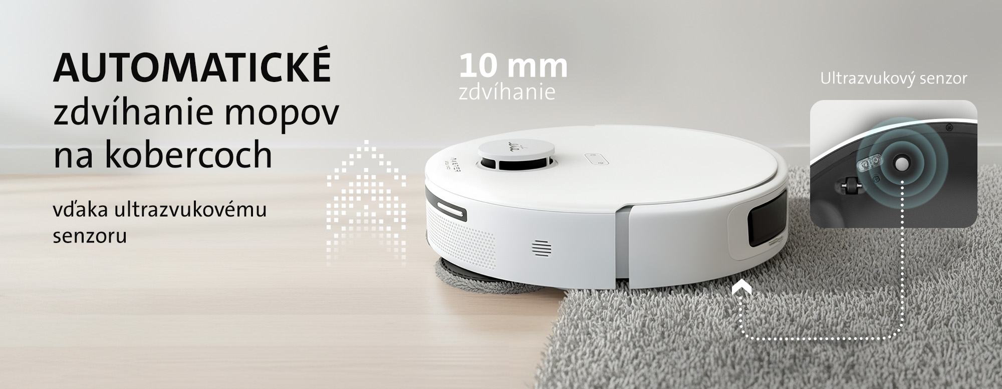 Robotický vysávač je vybavený ultrazvukovým senzorom, ktorý umožňuje funkciu Autoboost – automatické zvýšenie sacieho výkonu na kobercoch. Ak máte koberce s dlhým vlasom, v aplikácii je možné nastaviť aj funkciu „Vyhýbanie sa kobercom“.