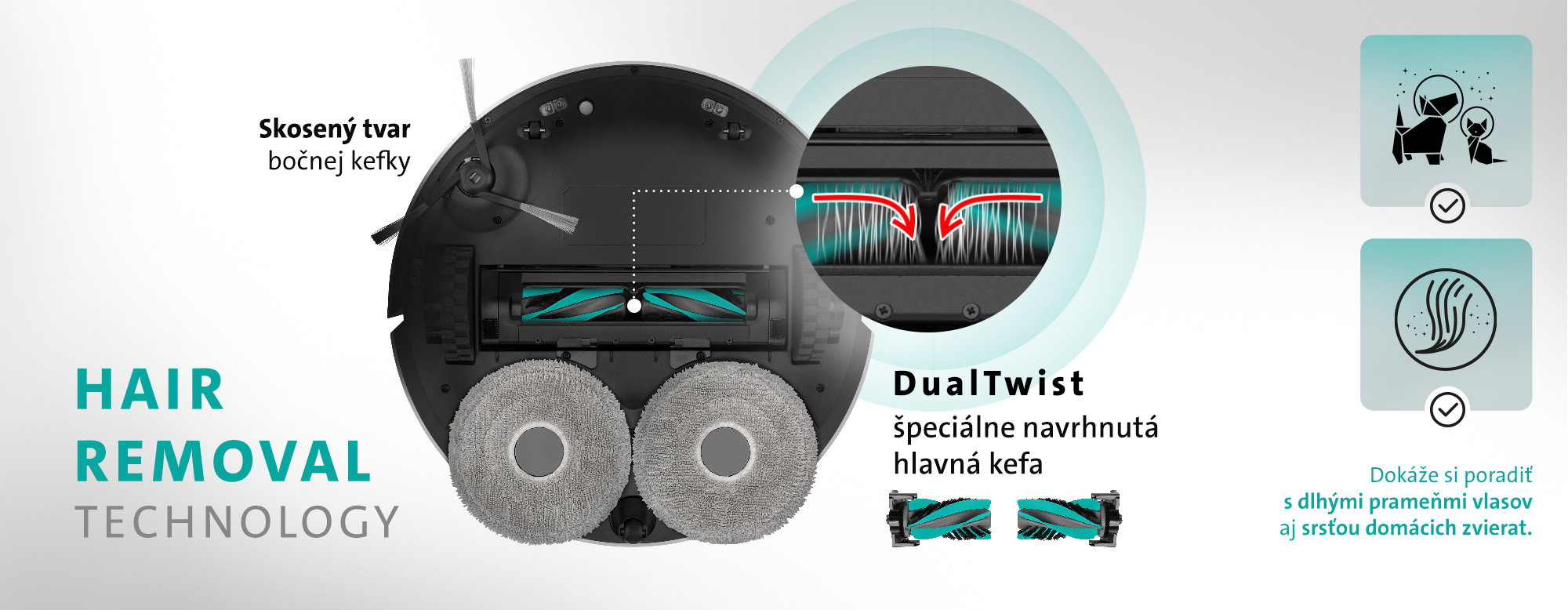 Hlavná rotačná kefa DualTwist – vďaka premyslenej dvojdielnej konštrukcii sa výrazne znižuje namotávanie vlasov a chlpov. Kónický tvar spôsobuje ich samovoľné uvoľňovanie a presun zo strán do stredu smerom k saciemu otvoru. Kombinácia lamiel a antistatických štetín zabezpečuje vynikajúce výsledky upratovania na tvrdých podlahách aj kobercoch. Tieto vlastnosti minimalizujú potrebu údržby kefiek a predlžujú životnosť vysávača.