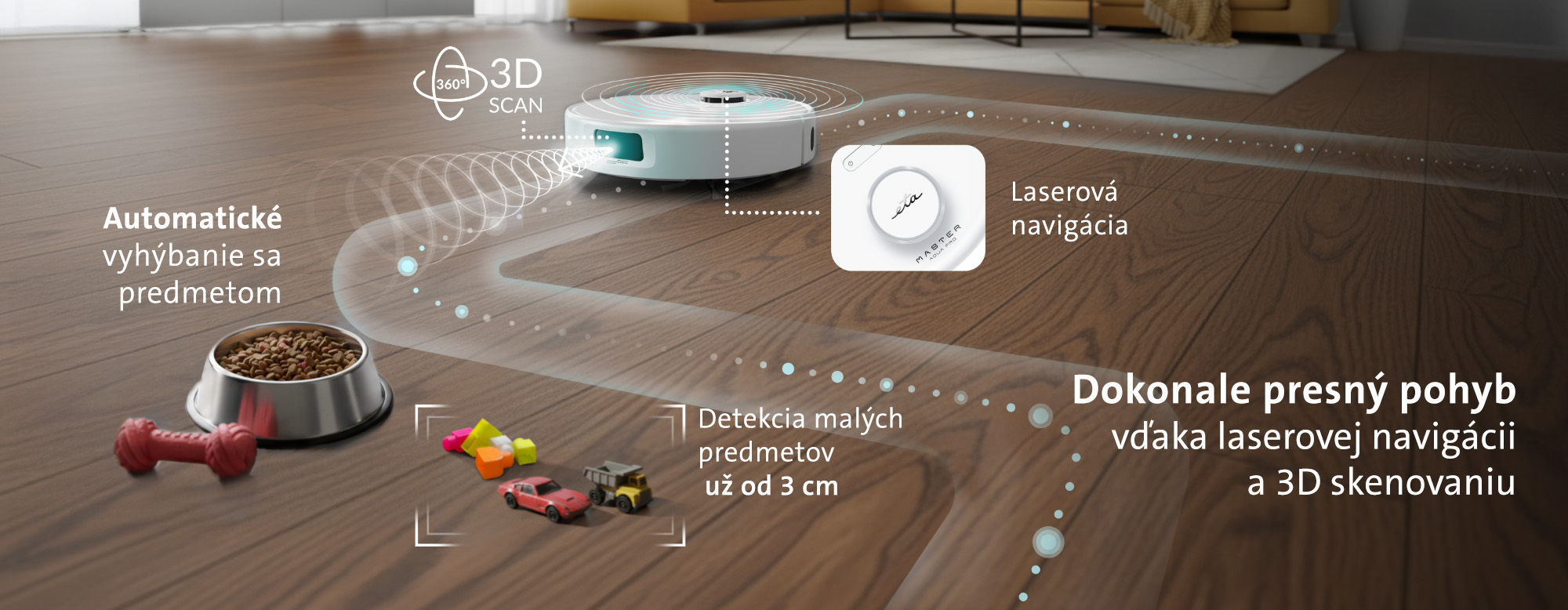 Technológia 3D skenovania (Adaptive Avoidance) bezpečne rozpozná drobné predmety vyššie ako 3 cm, ktoré zostali na podlahe, a vysávač sa im plynulo vyhne. Infračervené senzory so systémom Anti-Collision umožňujú plynulý pohyb s minimom nárazov do nábytku a stien a zabezpečujú automatický návrat do dokovacej stanice. Samozrejmosťou sú ochranné senzory proti pádu zo schodov, ktoré zaisťujú bezpečnú prevádzku aj vo viacpodlažných domácnostiach.