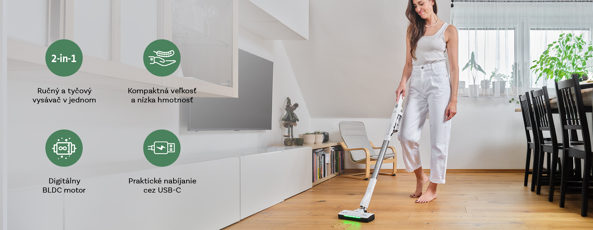 * Veľmi nízka hmotnosť - ručný vysávač 0,5 kg / tyčový vysávač 1,2 kg