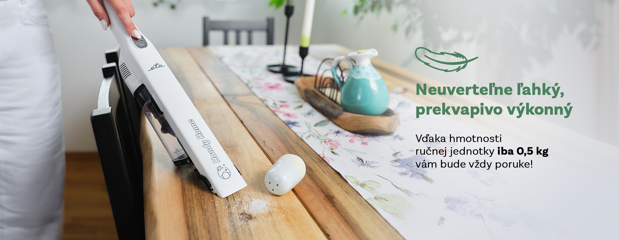 Vďaka svojej nízkej hmotnosti – len 0,5 kg v ručnom režime – je ETA Handy Home tak nenápadný, že o ňom skoro ani neviete. A napriek tomu, keď ho potrebujete, je vždy po ruke. Kompaktné prevedenie sa zmestí do každého kúta, či už ho máte postavený v obývacej izbe alebo uložený v kuchynskej skrinke.