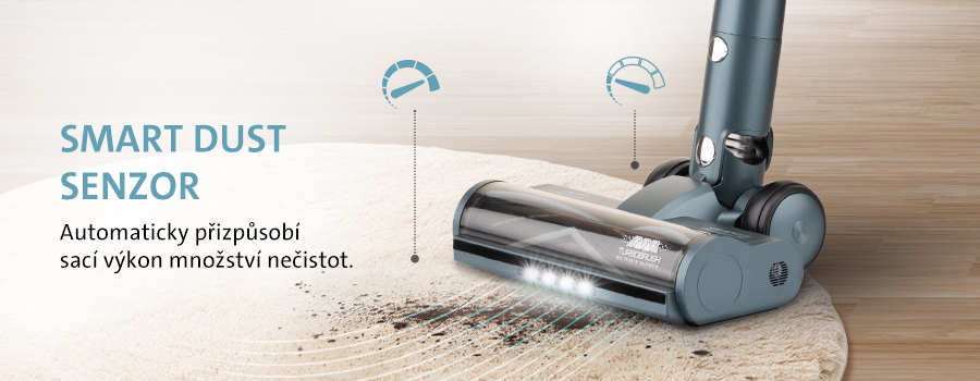Inovativní SMART DUST SENSOR automaticky rozpozná množství nečistot a podle toho automaticky upraví sací výkon. Vysavač tak vždy pracuje efektivně – na hladkých podlahách úsporně, na kobercích s maximální silou. Díky tomu šetří energii, prodlužuje výdrž baterie a zajišťuje dokonalý výsledek bez zbytečné námahy. K tomu přispívá vysoká účinnost a možnost nastavení 3 úrovní sacího výkonu včetně automatického režimu. Dvojitý HEPA filtrační systém zachytí při úklidu i ty nejjemnější prachové částice a alergeny. Speciální nerezový pre-filtr prodlužuje životnost hlavního filtru a zaručuje, že výkon vysavače zůstane dlouho na vysoké úrovni.