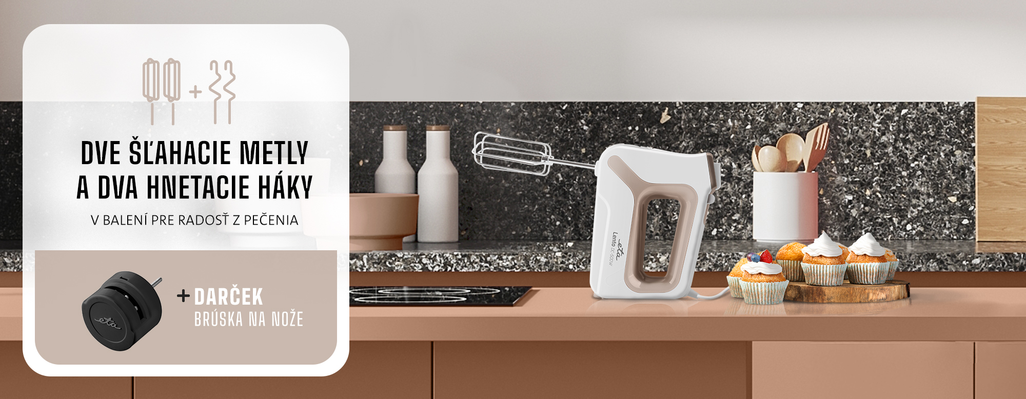 V balení nájdete dve dlhé šľahacie metly a dva hnetacie háky, ktoré ľahko nasadíte a vyberiete pomocou praktického tlačidla. Ako darček v balení nájdete brúsku na nože, ktorá vráti dokonalé ostrie aj starším nožom. Pre ešte väčšiu všestrannosť si môžete dokúpiť aj vyberateľný nerezový tyčový mixér ETA105100040, s ktorým pripravíte polievky, omáčky, mliečne kokteily alebo detské výživy raz-dva.