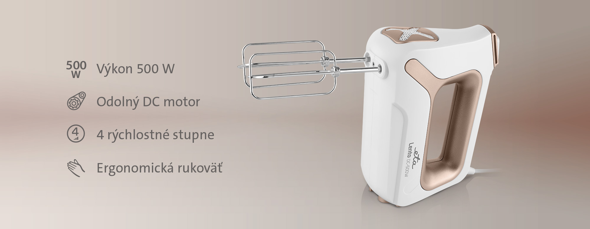 Ľahká konštrukcia a ergonomicky tvarované držadlo zabezpečujú pohodlné ovládanie aj pri dlhšom použití. Takže či už šľaháte smotanu na šľahačku, bielky na sneh, lievancové cesto alebo napríklad zemiakovú kašu, s ETA Lento je všetko hračka.