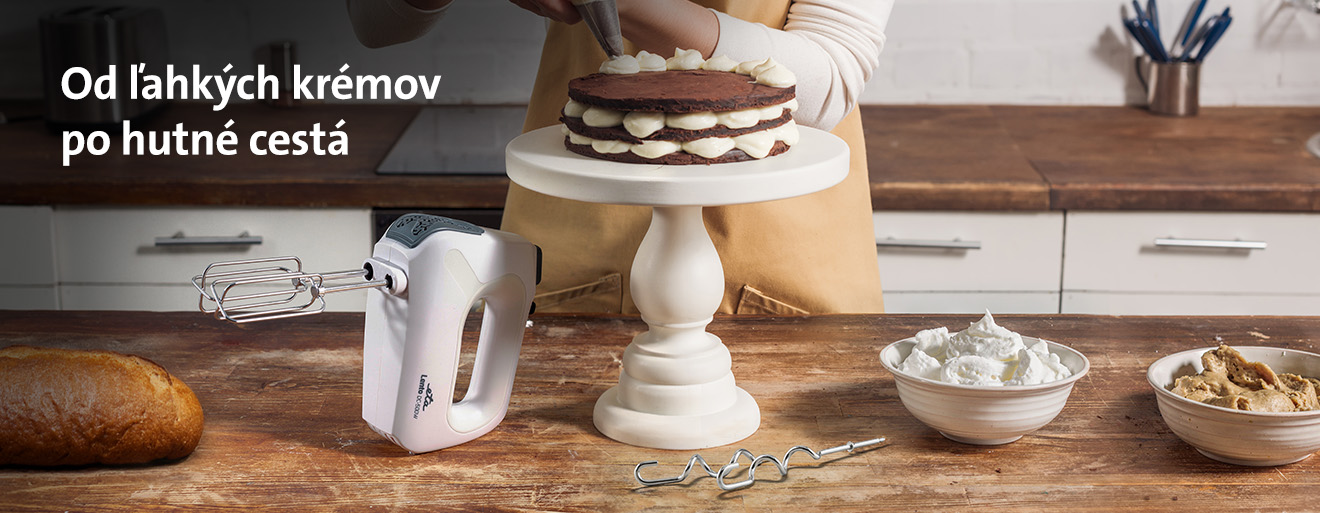 Ergonomicky tvarovaná rukoväť dobre sadne do ruky a spolu s odľahčenou konštrukciou šľahača zabezpečuje pohodlnú manipuláciu aj pri dlhšom šľahaní. Dve dlhé šľahacie metly zabezpečujú dokonalé premiešanie surovín a miesiace háky s dĺžkou 200 mm si poradia s kysnutým aj hutnejším cestom. Jeden prístroj tak bez problémov zastúpi viac úloh. Tlačidlo na jednoduché uvoľnenie metiel a hákov urýchľuje výmenu príslušenstva aj následné čistenie.