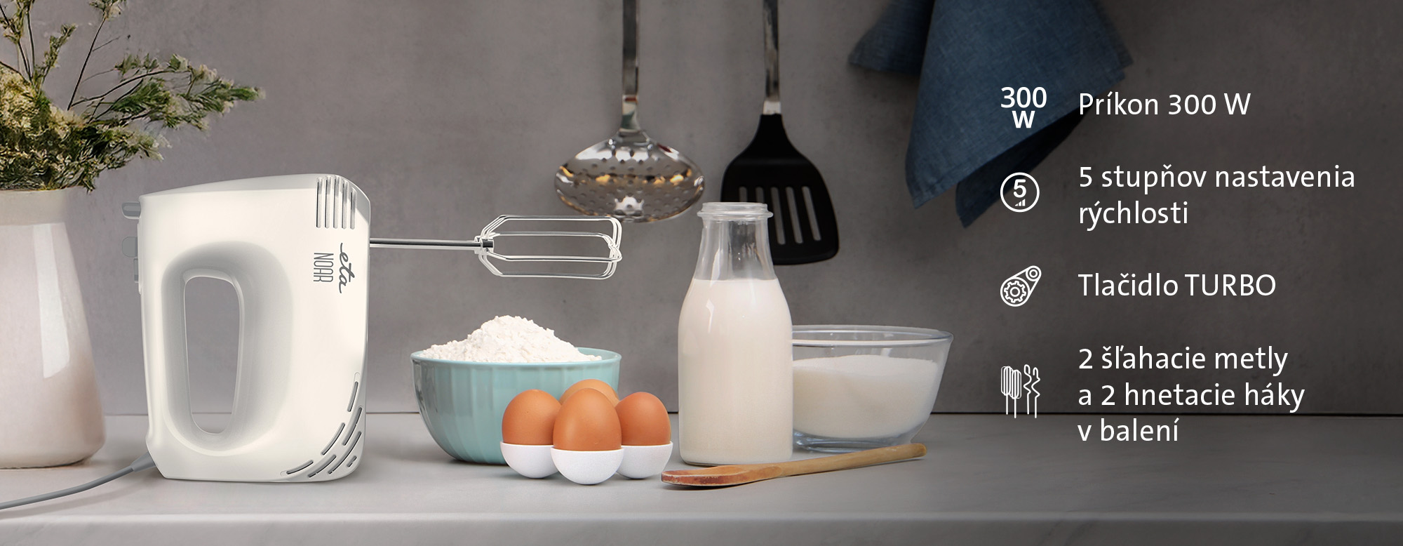 Ručný šľahač ETA Noar II vám bude skvelým parťákom pri pečení aj varení. Zaberie minimum miesta, ľahko sa ovláda a súčasťou balenia má 2 šľahacie metly a 2 hnetacie háky. Vďaka tomu s ním ľahko vyšľaháte šľahačku, sneh, pripravíte cesto na palacinky či dokonalý tortový krém. A poradí si aj so zemiakovou kašou či nátierkami.