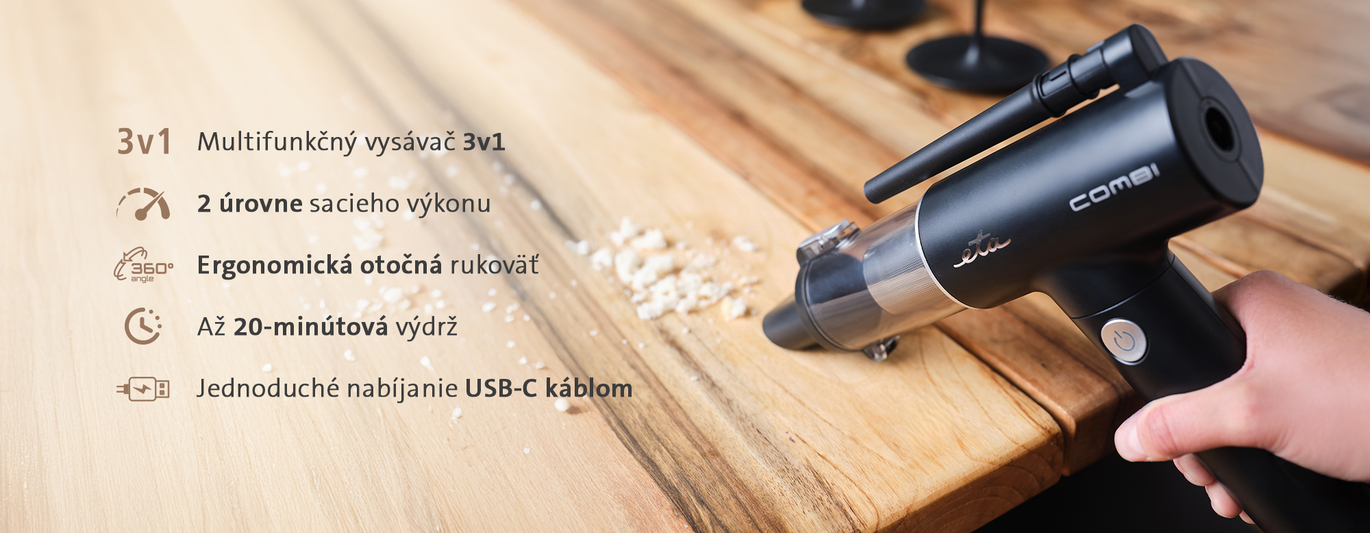 Ručný vysávač ETA Combi je malý, ľahký, ľahko skladný a s otočnou ergonomickou rukoväťou sadne presne do ruky. Dve úrovne sacieho výkonu a výdrž až 20 minút vám dávajú kontrolu aj flexibilitu, zatiaľ čo kvalitný HEPA filter s nerezovým predfiltrom sa postará o čistý vzduch počas upratovania.