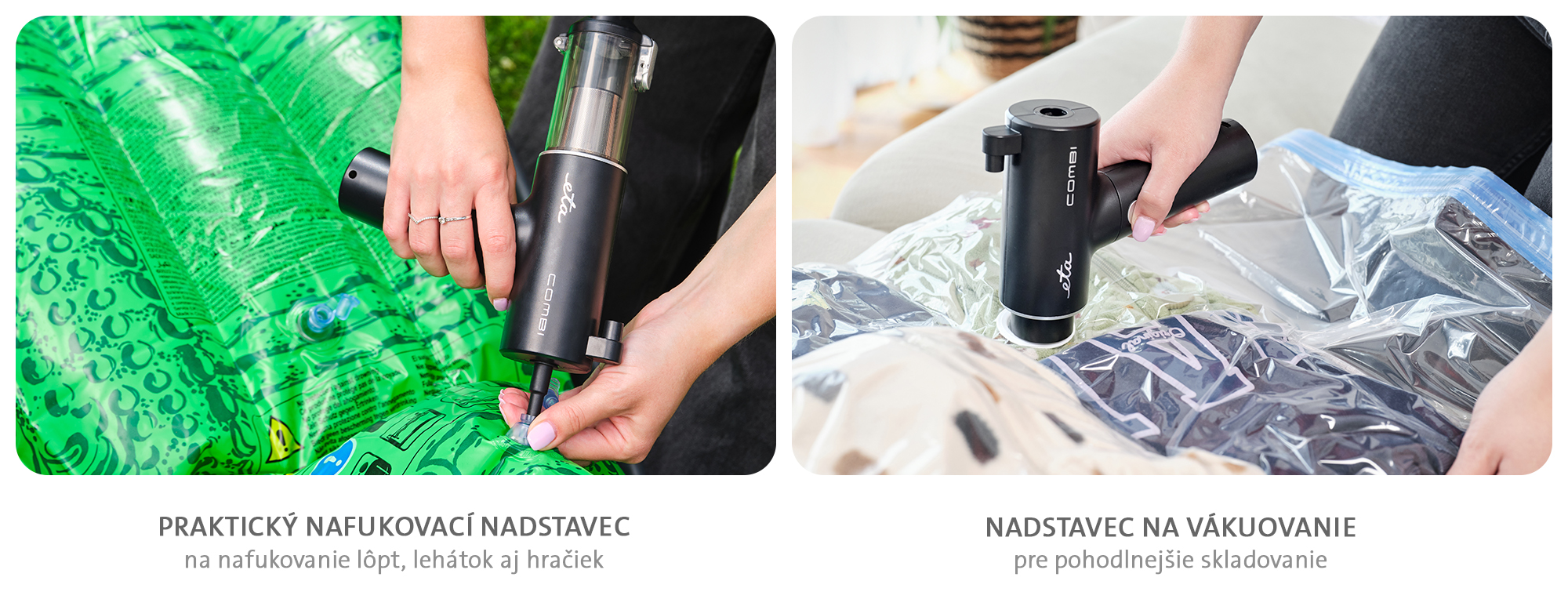 ... premení sa ETA Combi na praktický nafukovač. Ležadlá, matrace, lopty alebo párty balóniky? Stačí nasadiť správny nadstavec. A ak doma riešite nedostatok skladovacieho priestoru, poteší vás možnosť vákuovania oblečenia či perín do vákuovacích vriec. Dokonca pomôže rozfúkať oheň v grile alebo rýchlo vyfúkať klávesnicu. Vďaka funkcii fúkania vzduchu zvládne to, čo iné vysávače nedokážu.