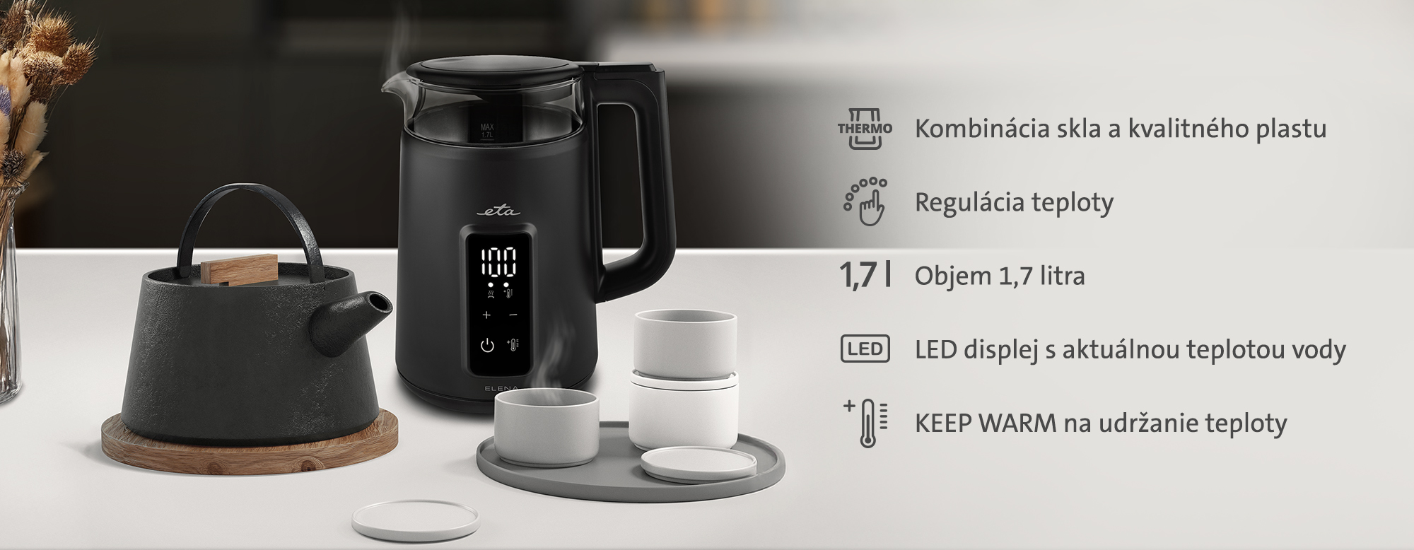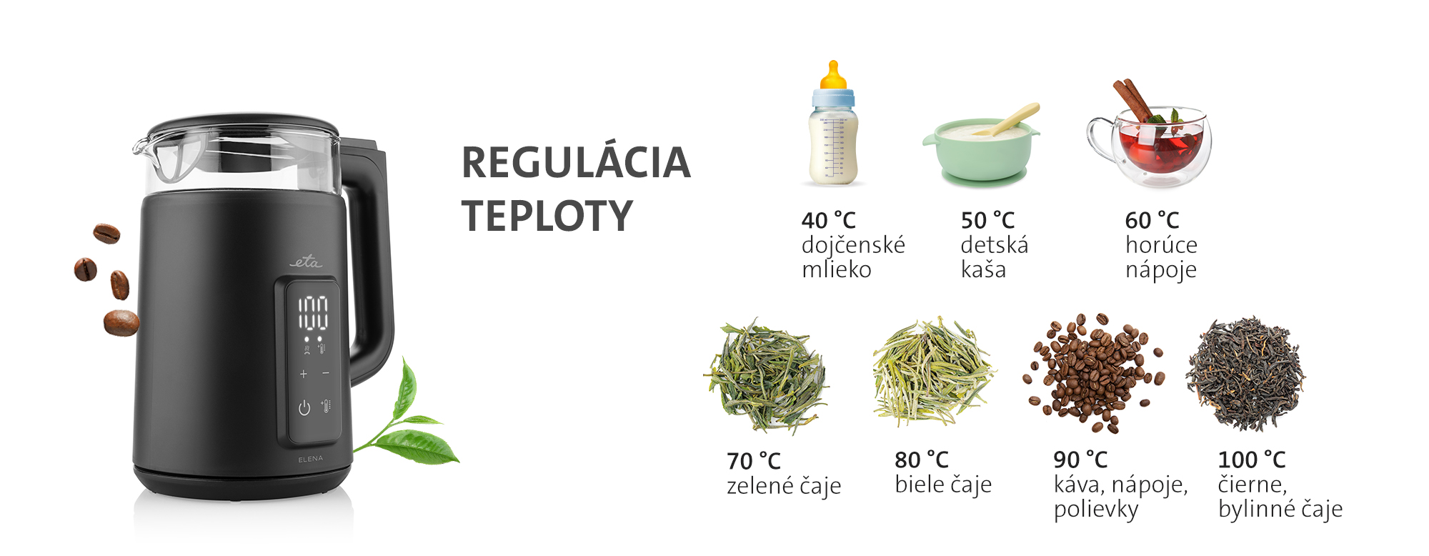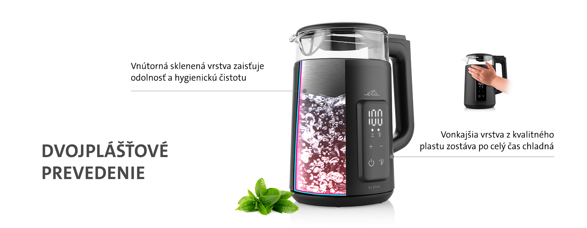 Sklenená rýchlovarná kanvica ETA Elena v dvojplášťovom prevedení bude nielen praktickým, ale aj štýlovým doplnkom každej modernej kuchyne. Na prehľadnom LED displeji pohodlne sledujete aktuálnu teplotu vody, pričom pomocou intuitívnych dotykových tlačidiel si jednoducho zvolíte presne takú teplotu, akú práve potrebujete – od 40 do 100 °C.