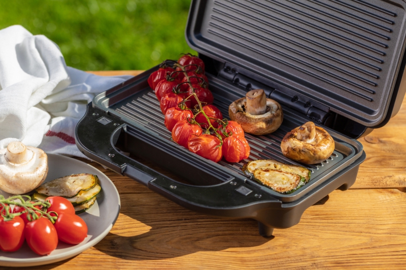 Větší prostor na zapékání s 6 vyměnitelnými zapékacími pracovními plochami na grilování, lívance, koláčky, panini, tousty, vafle s nepřílnavou úpravou. Teplota se nedá regulovat, je regulována automaticky. Má protiskluzové nožičky. Dobře se udržuje. Pěkný design.