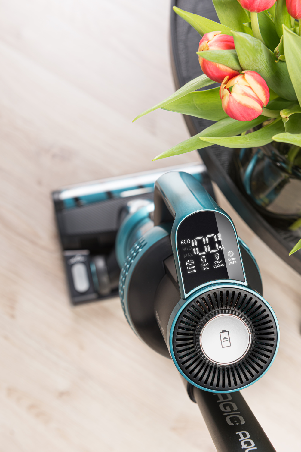 Aj napriek tomu, že ETA Magic AquaPlus vyzerá mohutne a nedostupne, pracuje sa s ním veľmi ľahko a intuitívne. Pohodlná ergonomická rukoväť vám padne sama do ruky a jeho moderný dizajn nebude robiť hanbu v žiadnom interiéri. O všetkom budete mať dokonalý prehľad vďaka praktickému displeju a svetelnej signalizácii. Tá indikuje nielen prevádzku vysávača, ale tiež nabíjanie a vybitie akumulátora.