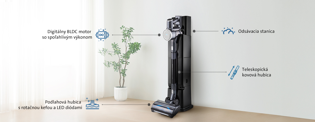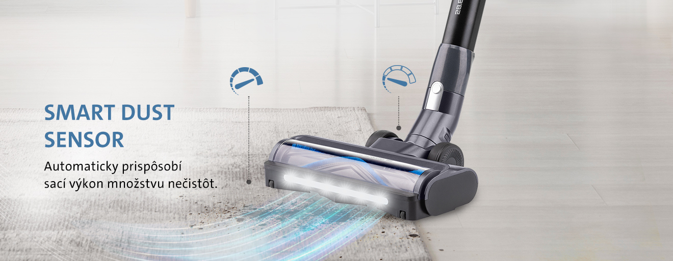 Inovatívny SMART DUST SENZOR automaticky rozpozná množstvo nečistôt a podľa toho upraví sací výkon. Vysávač tak vždy pracuje efektívne – na hladkých podlahách úsporne, na kobercoch s maximálnou silou. K tomu prispieva vysoká účinnosť vysávania vďaka digitálnemu BLDC motoru a možnosť nastavenia 3 úrovní sacieho výkonu.