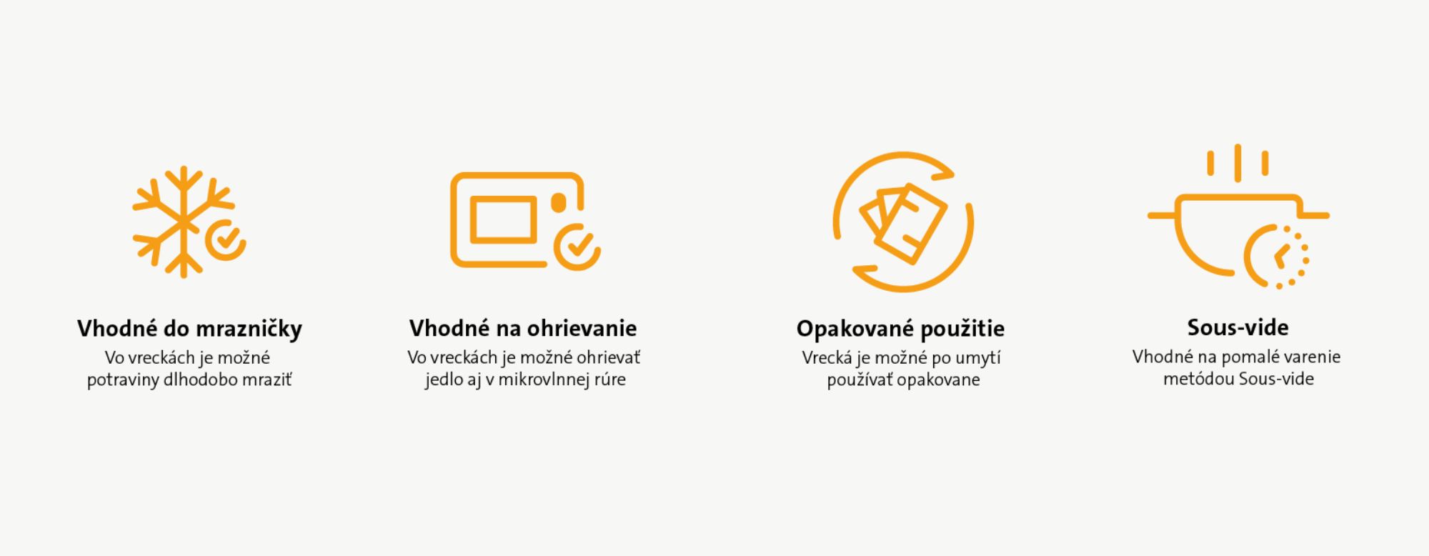 • Potraviny vo vrecúškach je možné zmrazovať a ohrievať
