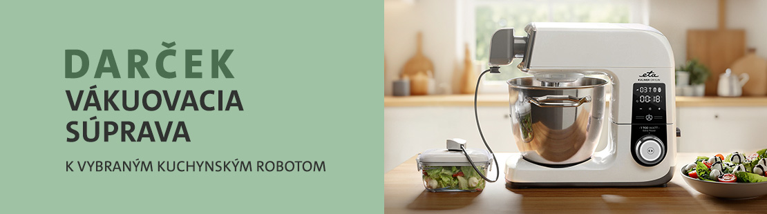 Darček vákuovacia súprava ETA sa automaticky načíta v košíku pri zakúpení jedného z vybraných modelov kuchynských robotov. Akcia sa nevzťahuje na model ETA203890010 a rad MEZO. Darček nie je predmetom kúpnej zmluvy, nevzťahujú sa naň práva z chybného plnenia a nie je možné ho reklamovať. V prípade vypredania zásob môže byť akcia ukončená aj pred plánovaným termínom.