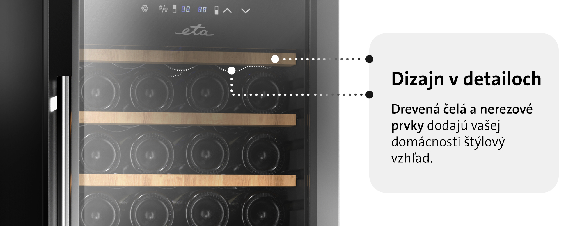 Vinotéka ETA 953590010GN ponúka priestor až pre 32 fliaš (objem 86 l) a vytvára ideálne podmienky pre ich skladovanie. Je to ako mať malú vínnu pivničku priamo doma – navyše elegantnú a ľahko prístupnú kedykoľvek dostanete chuť na pohár vína.