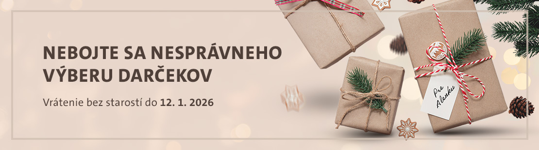Darčeky zakúpené v období 24. 11. – 24. 12. 2025 je možné vrátiť kompletné (vrátane príslušenstva, záručného listu, návodu a s kópiou nákupného dokladu), nerozbalené, nepoužité a nepoškodené do 12. 1. 2026.