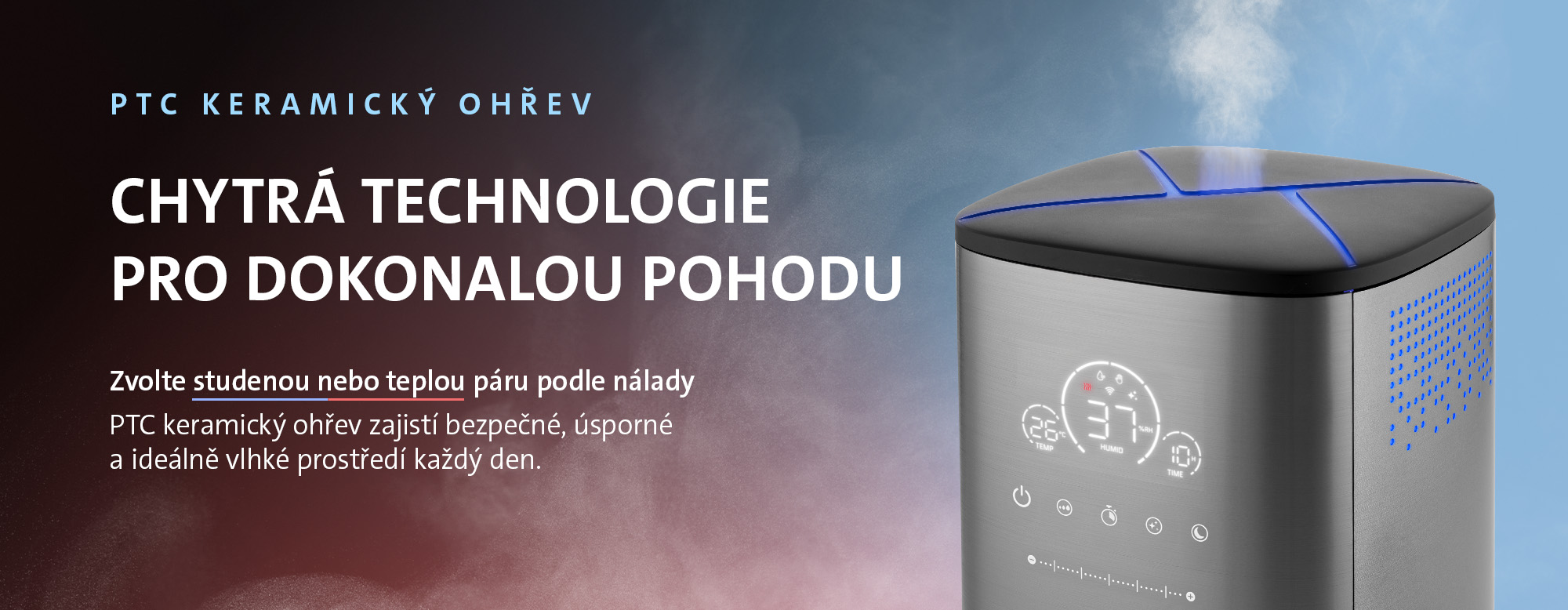 Automatický režim udržuje ideální vlhkost podle aktuální teploty v místnosti, takže se nemusíte o nic starat. Můžete si také volit mezi studenou a teplou párou, kterou přístroj vytváří pomocí bezpečné a úsporné PTC technologie s keramickým ohřevem – sama se reguluje a zabraňuje přehřátí. Díky možnosti nastavení relativní vlhkosti v rozmezí 30–75 % a až sedmistupňové regulaci výkonu si snadno přizpůsobíte klima svým potřebám. Přidáním několika kapek oblíbeného aroma oleje do speciálního zásobníku pak vytvoříte doma uvolňující atmosféru plnou svěží vůně.
