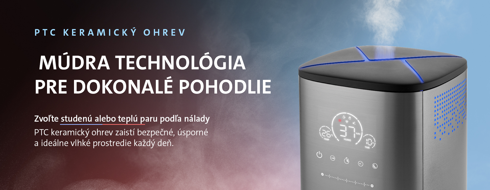 Automatický režim udržiava ideálnu vlhkosť podľa aktuálnej teploty v miestnosti, takže sa nemusíte o nič starať. Môžete si zvoliť studenú alebo teplú paru, ktorú prístroj vytvára pomocou bezpečnej a úspornej PTC technológie s keramickým ohrevom – tá sa sama reguluje a zabraňuje prehriatiu. Vďaka možnosti nastavenia relatívnej vlhkosti v rozsahu 30 – 75 % a až sedemstupňovej regulácii výkonu si jednoducho prispôsobíte klímu svojim potrebám. Pridaním niekoľkých kvapiek obľúbeného aróma oleja do špeciálneho zásobníka si doma vytvoríte uvoľňujúcu atmosféru plnú sviežej vône.