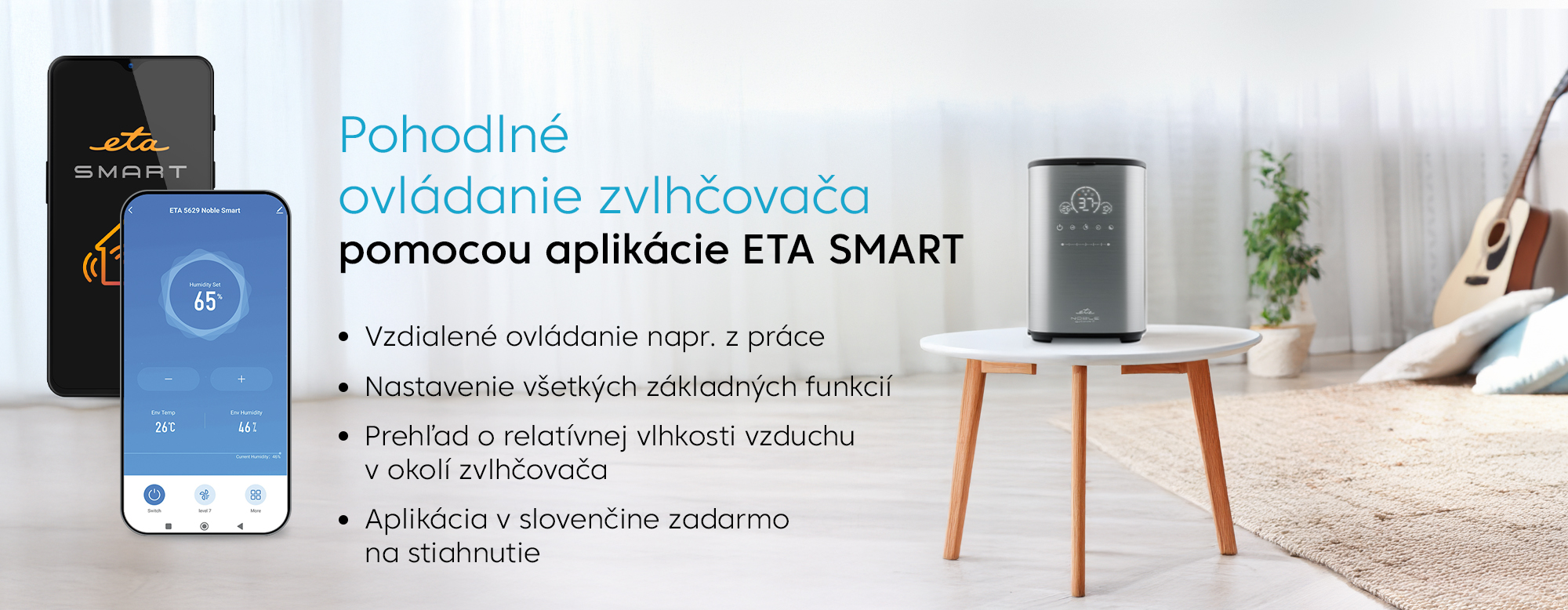 Zvlhčovač ETA môžete ovládať presne tak, ako vám to vyhovuje. K dispozícii je prehľadné dotykové ovládanie priamo na prístroji, ktoré umožňuje jednoduchý a intuitívny prístup ku všetkým funkciám. Ak uprednostňujete komfort, oceníte praktické diaľkové ovládanie, vďaka ktorému môžete meniť nastavenia bez nutnosti vstávať z pohovky. Ešte viac možností prináša inteligentná aplikácia ETA SMART, dostupná zdarma v češtine. Pomocou Wi-Fi pripojenia umožňuje vzdialené ovládanie zvlhčovača odkiaľkoľvek – napríklad z práce. Jednoducho zapnete alebo vypnete prístroj, naplánujete jeho prevádzku či nastavíte časovač v rozsahu 1 – 12 hodín. Aplikácia zároveň poskytuje prehľad o aktuálnej vlhkosti vzduchu a teplote, takže máte kvalitu vzduchu vo svojej domácnosti neustále pod kontrolou.