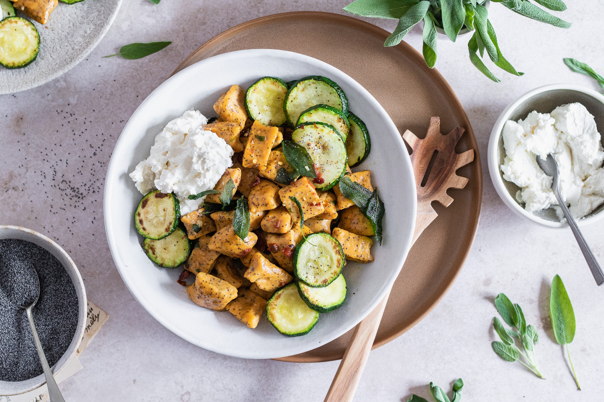 Kombinácia sladkastých batatov v spojení s lahodnou a sviežou ricottou chutí výborne. Preto sa priamo ponúka ricottu s haluškami nielen podávať, ale tiež trochu primiešať do cesta. A nezabudnite na mak, ktorý krásne a jemne zachrumká medzi zubami.