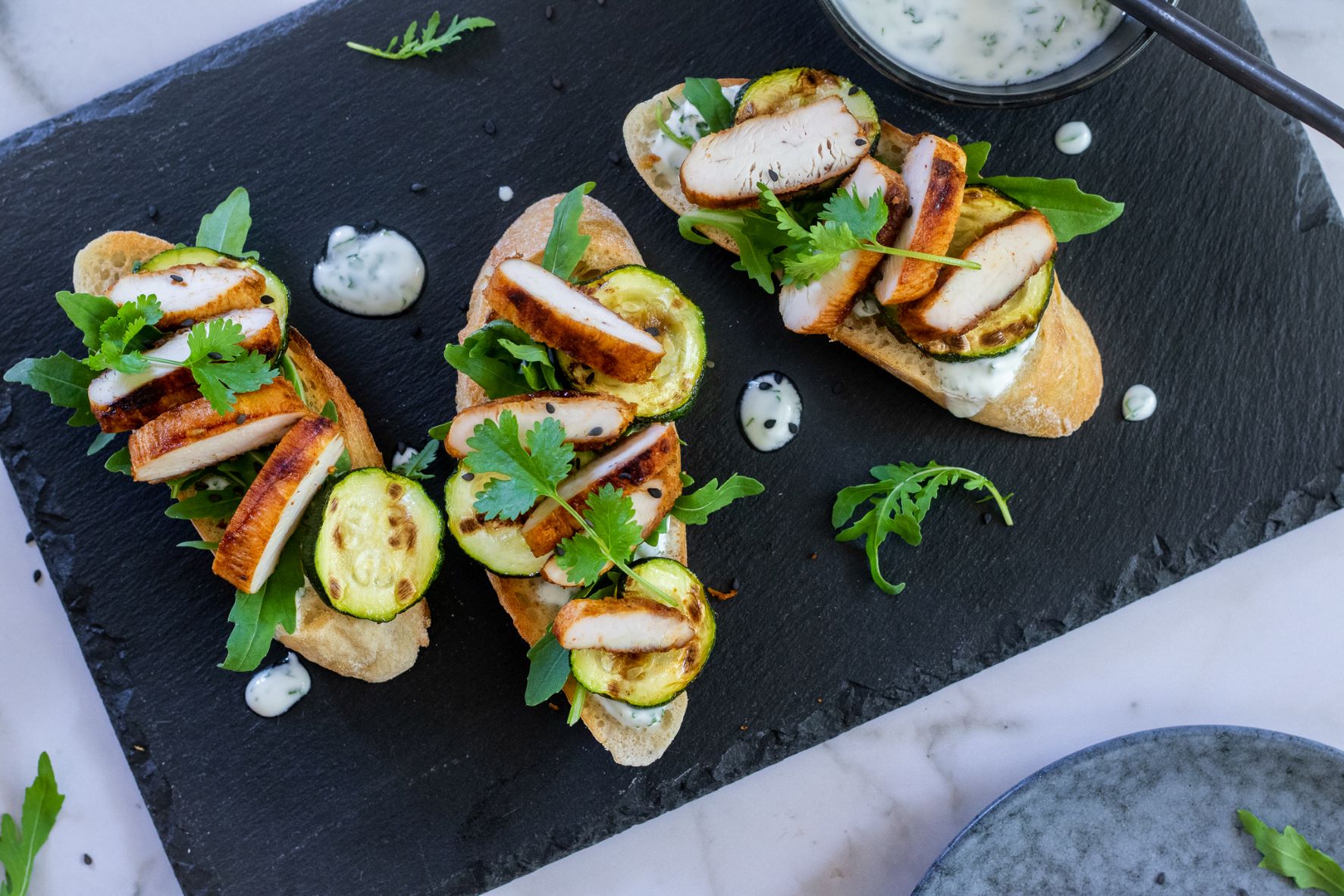 Jednohubky sú málo a hlavné jedlo veľa? Pripravte pre návštevu či rodinu na desiatu chlebíčky s grilovaným kuraťom a cuketou so sviežim dresingom podľa blogerky Martiny Lacingerové.
