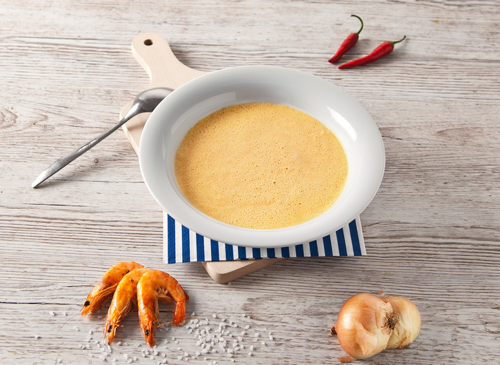 4. Uvarenú polievku rozmixujte dohladka, do Vital Blendu môžete naliať aj horúcu polievku. Podávajte ozdobenú grilovanými krevetami.