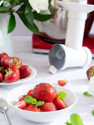 Pripravte si nadstavec na výrobu zmrzliny. Kúsky jahôd nasypte dovnútra a pretlačte do misky. Väčšinu nasekanej bylinky pridajte do sorbetu a zvyšnú časť nechajte na posypanie pri servírovaní. Hmotu zalejte proseccom a premiešajte. Ak ovocie povolilo viac a prajete si mať sorbet viac zmrznutý, na chvíľu ho môžete dať do mrazničky.